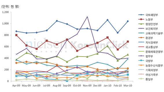 청와대를 포함한 중앙정부 15개 부처의 웹사이트3 는 지난 1년 월평균 300만여명 이상이 꾸준하게 방문하고 있으며, 국민의 실생활과 보다 밀접하게 관련되어 있는 부처 웹사이트의 성과가 더욱 뛰어난 것으로 나타났습니다. 주택 정책, 세종시 발전방안 및 4대강 살리기 등 주요 쟁점사안을 담당하고 하고 있는 국토해양부 추정 방문자수가 가장 높았으며, 지난해 신종인플렌자 확산 이슈로 보건복지부 트래픽이 급증하였으나 해당 이슈에 대한 관심이 저조해지면서 올해 들어 트래픽도 동반 하락하였습니다. 또한 고용과 실업에 대해서 정보를 제공하고 적극적인 대책을 마련하고 있는 노동부 웹사이트는 구직율이 높아지는 시기에 따라 계절적 등락을 반복하고 있습니다.